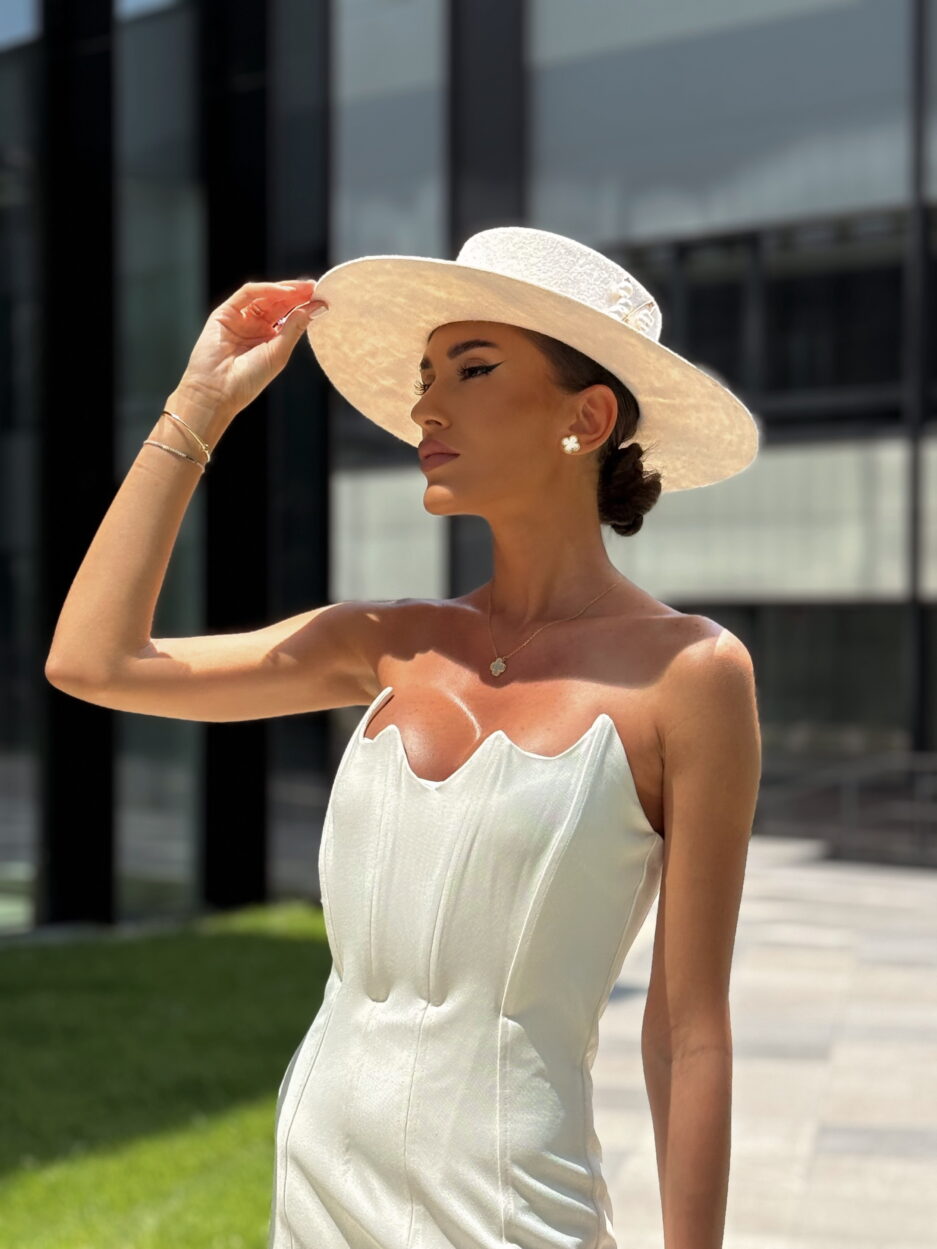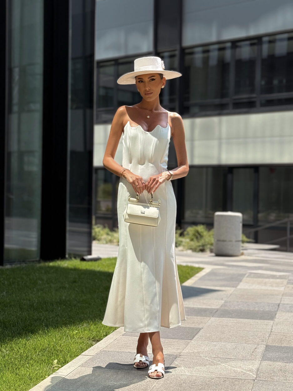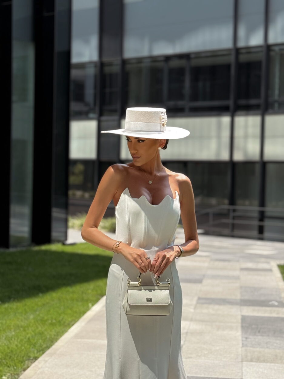 Această rochie pe corp este o declarație de rafinament și feminitate. Construită cu balene fine la baza decolteului, oferă susținere și o structură impecabilă ce conturează delicat bustul, amintind de eleganța corsetelor clasice. Croiala mulată urmează linia corpului, accentuând silueta și adăugând o notă sofisticată, perfectă pentru apariții memorabile.